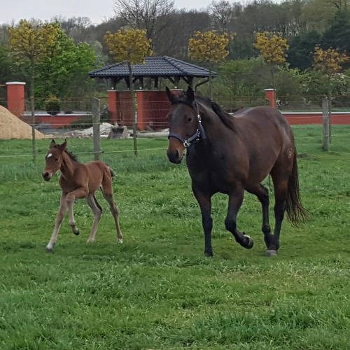 Hosszas várakozás után április 5-én végre megszületett Gréti – Hot Little Pine – és Great Sun Burst csikója. Nagyon büszkék vagyunk rá, hogy Magyarországon eddig csak nálunk született a 4-szeres világbajnoktól csikó, és az külön egyedülálló, hogy kettő is. Reméljük mindkettő méltó utódja lesz édesapjuknak.